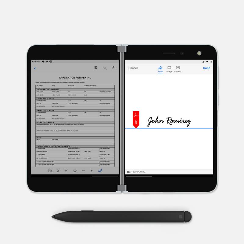 Surface Duo配备了双5.6英寸AMOLED屏幕,分辨率为1800×1350,展开后可以扩展到8.1英寸(2700×1800)。这款手机的薄度也令人印象深刻。微软表示,Duo打开时厚度仅为4.8mm,合上时厚度为9.9mm。由于采用了微软设计的定制处理器,该设备还支持Surface Pen。微软还为Surface Duo提供360度铰链、玻璃机身、Android 10以及所有谷歌服务。