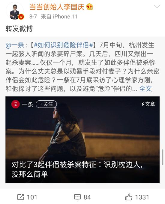 俞渝还提到,8月11日,李国庆在微博上点赞了“江苏男子法院门口捅死离婚妻子”。再往前,他还微博转发了“杭州杀妻碎尸案”。