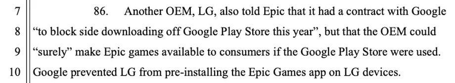 Epic 还表示谷歌阻止 LG 在旗下手机上预装 Epic Games 应用程序。当 The Verge 与谷歌联络时,谷歌拒绝评论这些交易的细节。
