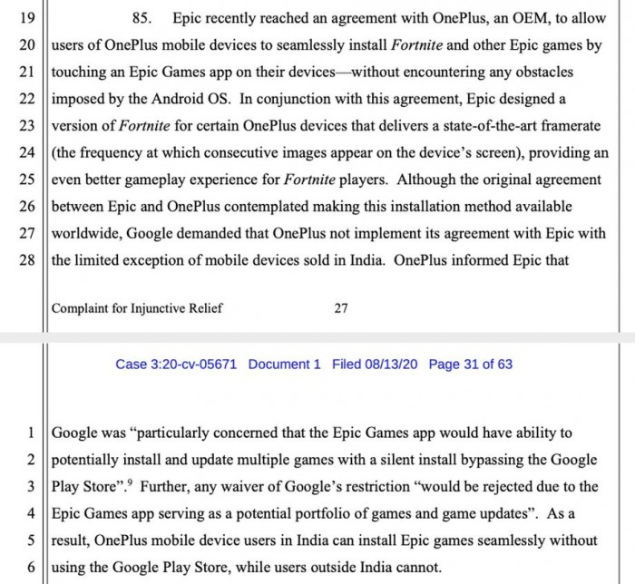 Epic 表示在谷歌发现游戏支付可能绕过 Play Store 之后,谷歌强制要求一加放弃这项交易。Epic 还声称,Epic 与一加之间的交易原本计划在全球范围内发售的手机中预装该启动器,不过谷歌要求一加不执行与 Epic 的这项协议,只有在印度地区销售的移动设备除外。