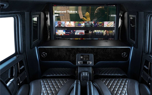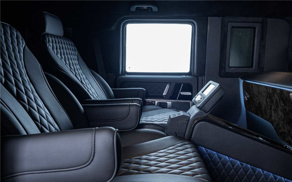 官方表示,AMG G63防弹加长版轴距达到了夸张的4.4米,车内采用四座布局。配置方面十分豪华,像座椅加热、座椅通风、座椅按摩等应有尽有,凡是手能触及之处均采用Alcantara以及真皮包裹。