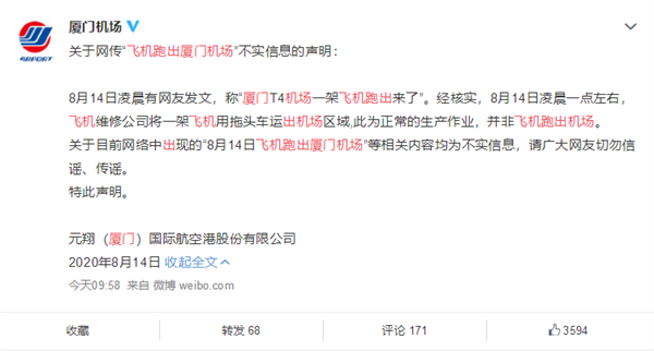 关于网传“飞机跑出厦门机场”不实信息的声明: