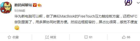 微博大V@数码闲聊站 爆料称,这次的华为新电脑做了类似苹果MacBook的FreeTouch压力触控板方案,同时还把NFC做到里面了,多屏协同更方便。