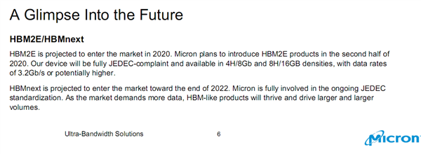 至于HBMNext,美光表示将全程参与JEDEC的标准制定工作,预计2022年面世,但目前尚未确定任何具体技术细节。
