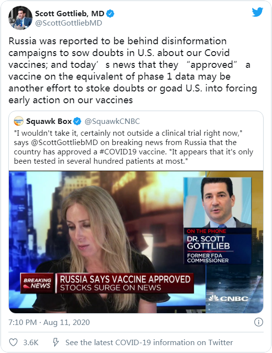尽管俄罗斯率先批准了首个新冠病毒疫苗,但前 FDA 理事 Scott Gottlied 博士在早前接受 CNBC 电话连线采访时称: