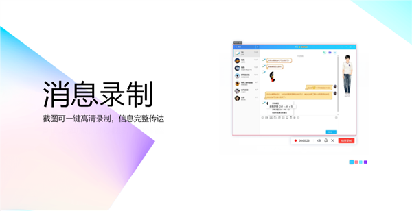 此外,新版本还加入全屏输入功能;支持图片编辑,在查看图片时即可自由编辑和裁剪;还支持消息录制功能,截图可一键高清录制,信息完整传达。