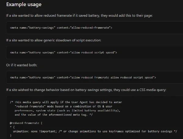 有了新的 "节电"Meta标签,网站所有者将能够命令浏览器按需操作,例如, "允许降低帧率"或 "允许降低脚本速度",从而为用户的电池余量节省一笔开销。