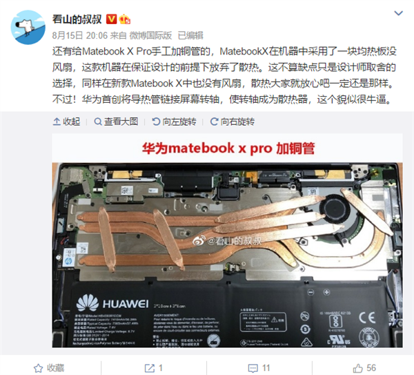 8月19日,华为就要推出新一代笔记本MateBook X了,这款13寸笔记本花了华为三年时间打造,设计上极具特色,3K悬浮全面屏,号称比A4纸还小。对轻薄笔记本来说,散热系统是个难题,而MateBook X在这方面也做出了新的尝试——微博用户@看山的叔叔爆料称,它采用了无风扇设计,使用的是均热板导热。