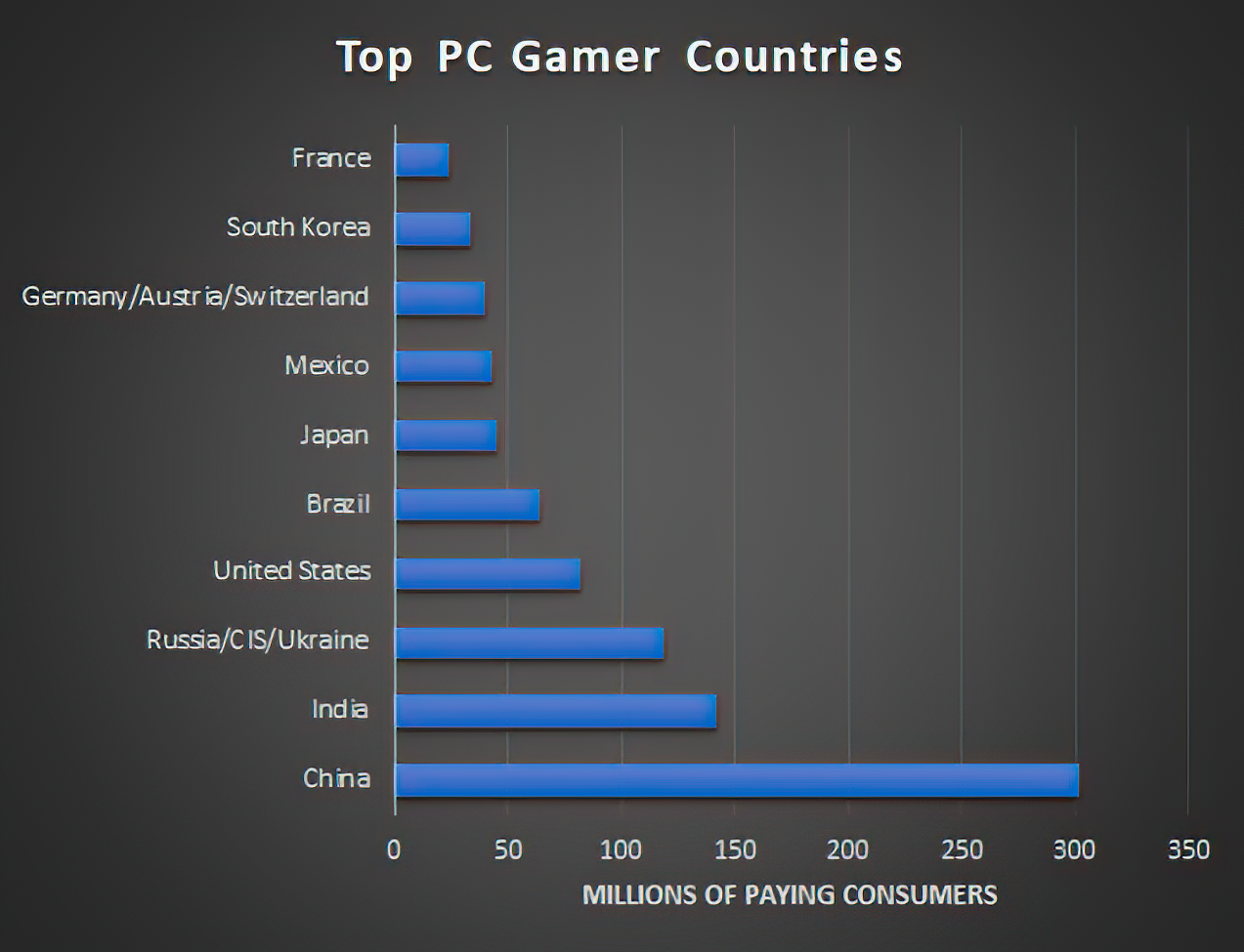 在PC玩家中,中国玩家数量最多,有3亿人。紧随其后的是印度1.5亿人。