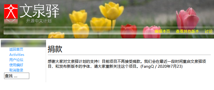 文泉驿官网今天贴出一行短短的公告:感谢大家对文泉驿计划的支持!目前项目不再接受捐款。我们会在最近一段时间重启文泉驿项目,和发布新版本的字体,请大家重新关注这个项目。(FangQ / 2020年7月23)