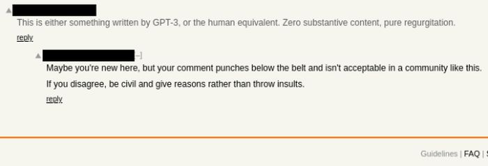 Porr 表示,他想证明 GPT-3可以作为人类作家被假冒。确实,尽管该算法的编写模式有些怪异,并且偶尔会出现错误,但是在他对Hacker News的最高帖子发表评论的数十个人中,只有三到四个人怀疑它可能是由算法生成的。所有这些评论都立即遭到其他社区成员的反对。