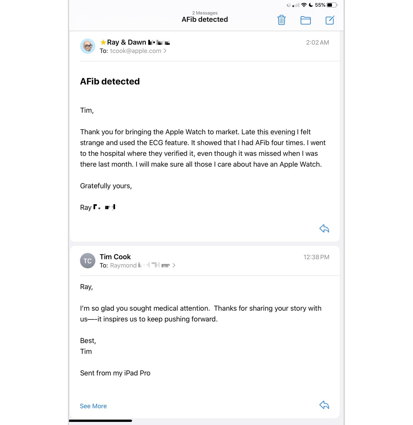 在提供给AppleInsider的邮件交流中,读者Raymond感谢库克 “将Apple Watch推向市场”。在信息发出的前一天晚上,Raymond表示自己 “感觉很奇怪”,并使用自己的Apple Watch和妻子的Apple Watch的心电图功能仔细检查了读数。