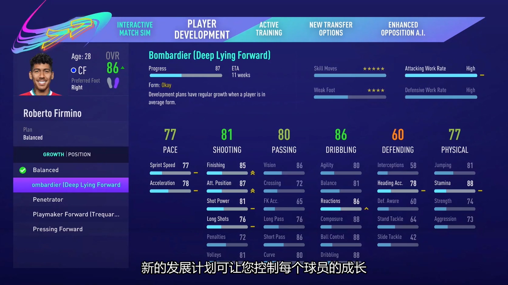 《FIFA 21》职业生涯模式中字预告片公开。《FIFA 21》将让玩家尽情发挥创意,控制球员在球场上每个角落的行动。在《FIFA》至今游戏玩法最具智慧的版本中,玩家将以全新动态进攻系统,前所未有地创造更多射门机会。