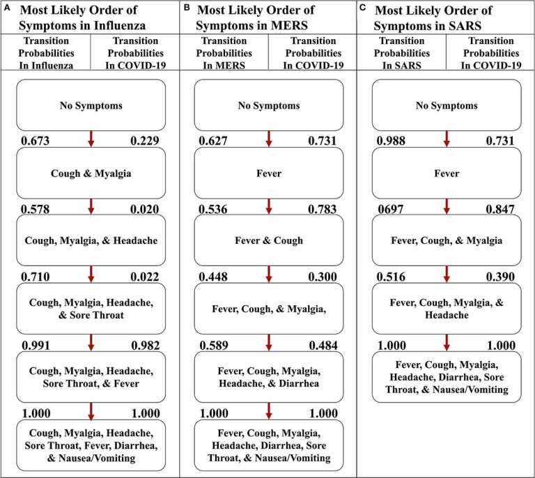 相比之下,以下是同一研究中流感、SARS和MERS最可能出现的症状顺序。