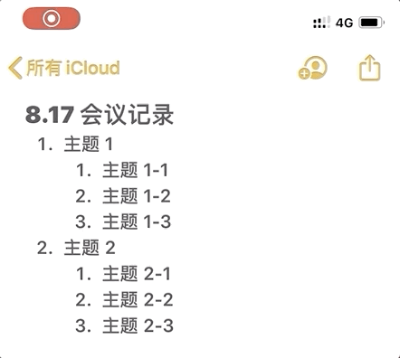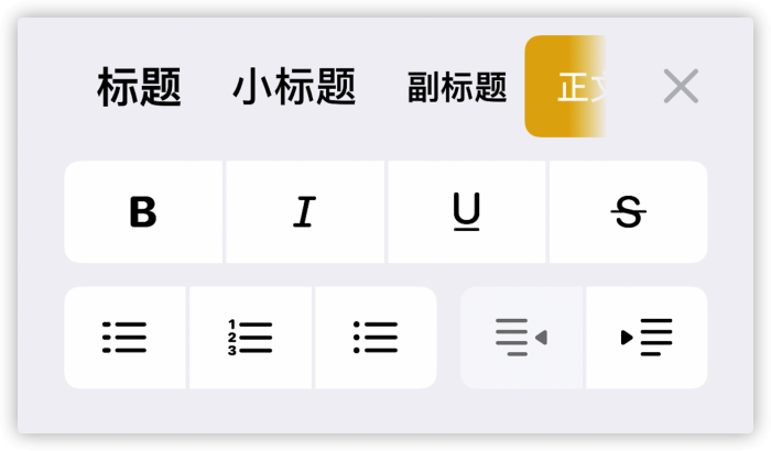 但有时面对一些较为复杂的记录事项时,不同标题和格式已经很难对内容进行整理,这时就需要用上“项目符号列表”和“表格”。在虚拟键盘的功能栏中选中“Aa”一项,左下角有三种项目符号列表样式,你可以根据记录的内容或者个人喜好进行选择,而且还可以通过手指在内容行上左右滑动来对不同项目进行提升/缩进。