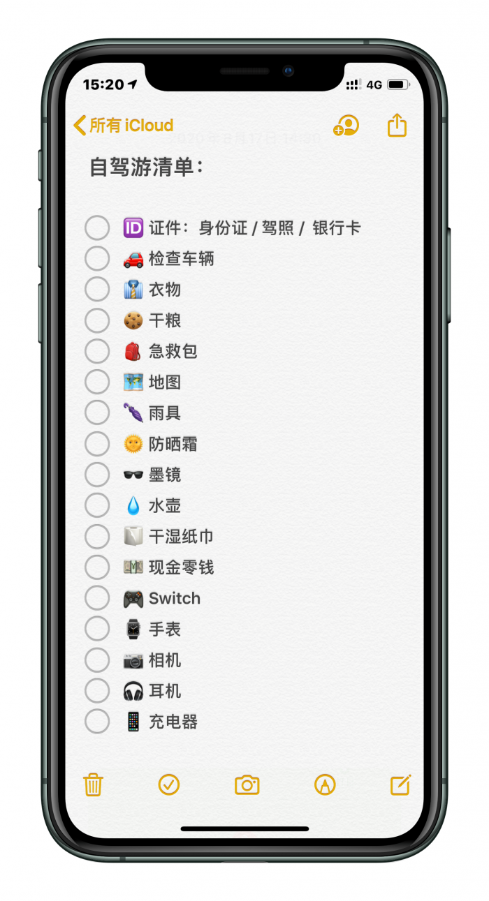 此外,备忘录还内置了一个小型的清单功能,虽然功能性方面无法与苹果自带的提醒应用相比,但却十分适合用来记录一些“To do list”的内容。