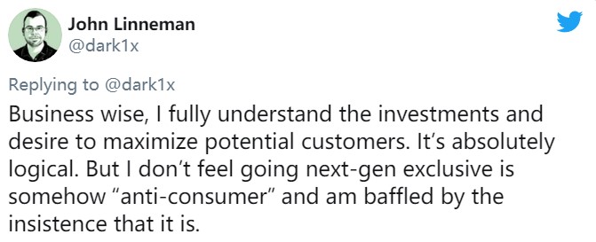 之后,John Linneman又发推对次世代的独占策略进行了称赞,他认为相比把资源投入到跨世代上,次世代独占作品从开发角度上来说是一个更明智的选择。