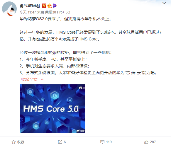 据微博博主@勇气数码君 最新曝料,华为鸿蒙OS 2.0确实要来了,新的智能手表、笔记本、平板机都会上,但是至少在今年,华为手机还不会搭载鸿蒙,因为手机对生态要求太高,华为内部对此非常谨慎。
