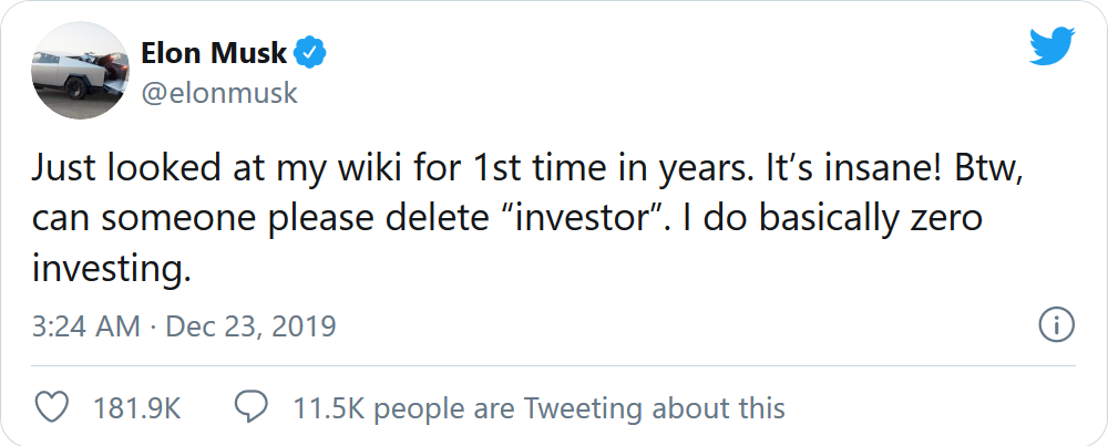 据悉,维基百科和埃隆·马斯克的恩怨始于2019年,当时这位科技亿万富翁在网站上对自己的页面进行了核实。而维基百科犯下的最大一个错误就是称马斯克是一位投资者。而据当时回应,他从未做过任何投资。