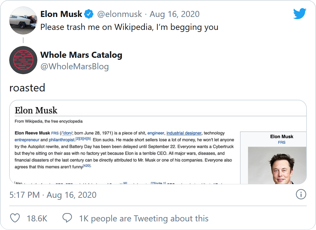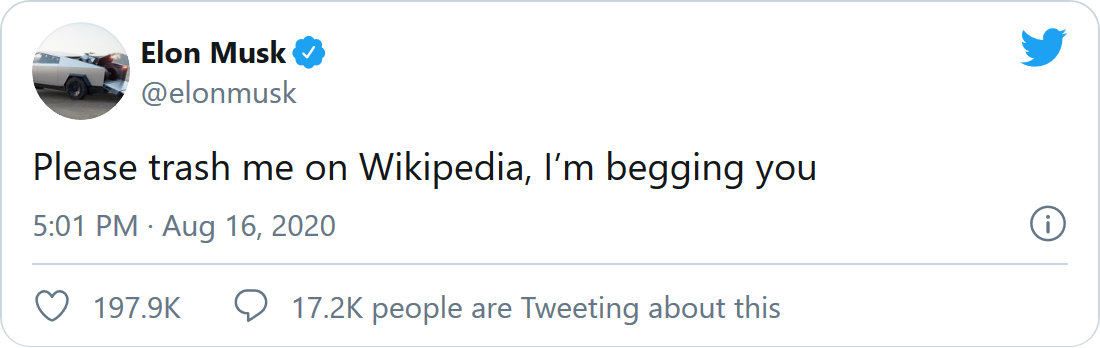据外媒报道,当地时间8月16日周日,SpaceX和特斯拉的CEO埃隆·马斯克的Twitter账号在其发文向他的粉丝和批评者发出一请求后再次走红。那么他究竟发了什么呢?--请求人们去破坏他的维基百科官方页面。