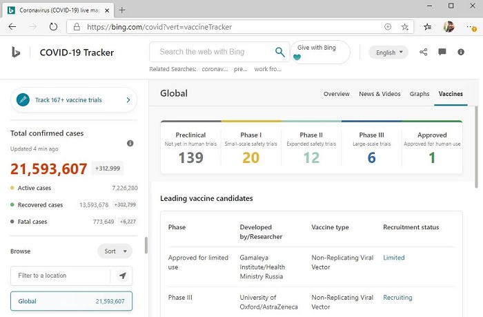 早在今年 3 月,微软旗下必应(Bing)搜索引擎就推出了基于网络上所有可用数据,而提供的一项全球新冠病毒追踪器服务。只需在搜索框中输入“COVID-19 / 新冠病毒”等关键词,必应就会返回当地和全球范围内已确诊、治愈、死亡病例等信息。