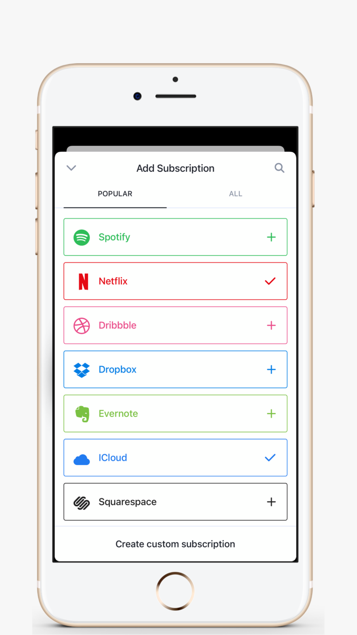 哪怕确实找不到正在订阅的服务,Bobby 还为你准备了一个“Create custom subscription”(创建个人订阅服务)选项,用户可以自主创建属于自己的订阅服务。因此,该软件理论上可以统计国内订阅服务,但可惜的是不能自主添加某个服务的图标。