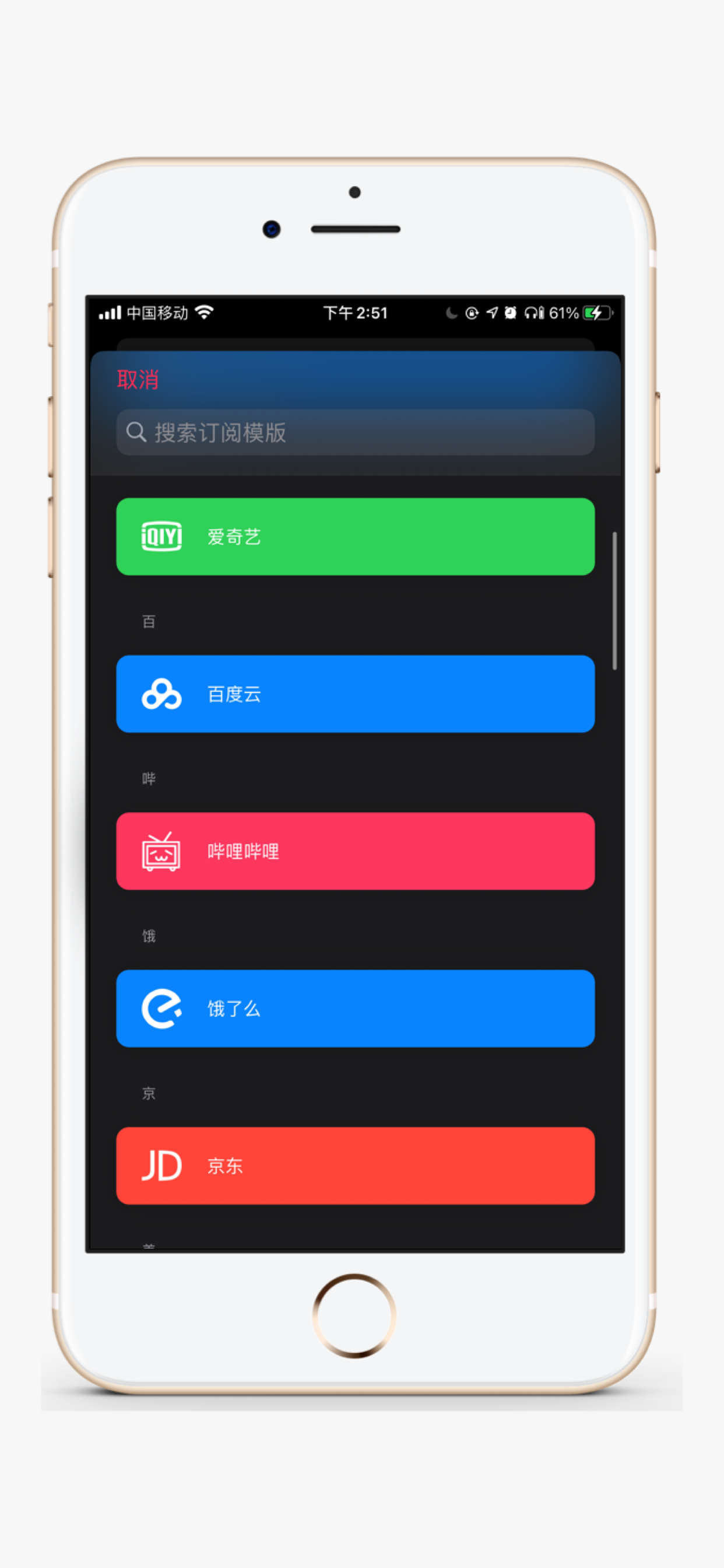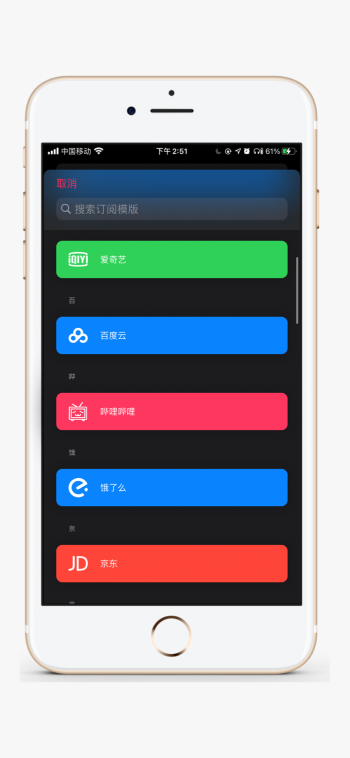 令人惊喜的是,Stack 内可选各种各样国内的订阅制服务,包括“饿了么”、“哔哩哔哩”、“京东”、“网易云音乐”等各种各样的服务。除了国内的服务,像是“Dropbox”、“Google Drive”、“Xbox”等国外服务也在选项内。订阅模板的总量虽不及 Bobby 多,但 Stack 亦可通过自定义的方式添加列表上缺少的订阅制服务。