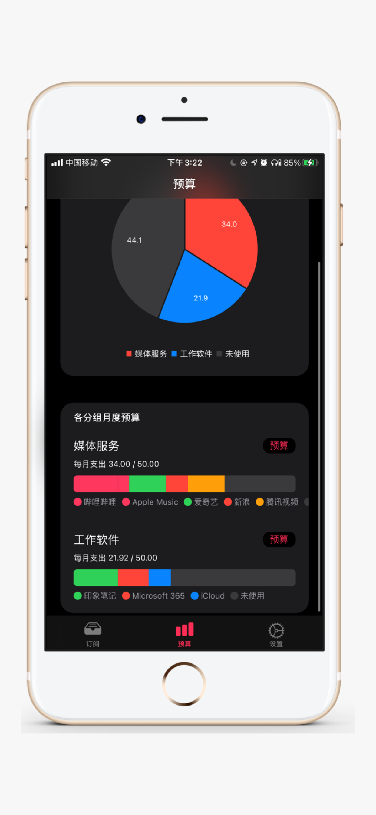 在体验了一段时间后,精美的 UI 以及智能的“预算”功能是我为这款 App 买单的原因。“预算”功能使用了饼状图的形式,直观地说明了用户每月在不同的服务所花费的金额,在下方还有横向柱状图为用户再次阐明。用户还可以设置每一个分组在每月的预算,提醒用户消费需谨慎。
