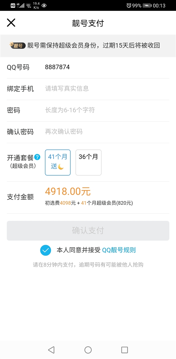 如果你想得到一个这样的7位豹子号QQ号码,那么需要支付至少4818元,包括4098元的初选费,加上36个月的超级会员费(720元)。
