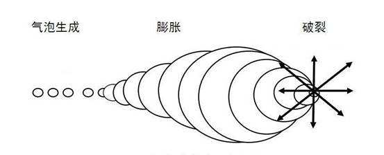 超声波作用于液体时可产生大量小气泡 ,超声波能量足够高时,存在于液体中的微小气泡(空化核)在超声场的作用下振动、生长并不断聚集声场能量,当能量达到某个阈值时,空化气泡就会急剧崩溃闭合,这就是超声波空化作用。空化作用产生的气泡寿命约为0.1μs,它在急剧崩溃时可释放出巨大的能量,并产生速度约为110m/s、有强大冲击力的微射流,使碰撞密度高达1.5kg/cm2。