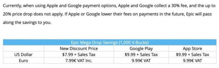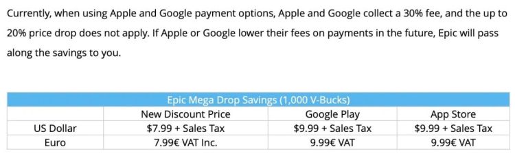 Epic Games 不仅在游戏内直白地比较了两种付费方式的价差,还在新闻稿里直接解释了价差的原因:苹果会在应用内付费时收取30%的费用,也即我们经常说的“苹果税”。
