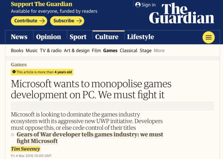 2016年3月,Sweeney 在《卫报》上发表观点文章,指责微软当时强推 Universal Windows Platform 是试图垄断 Windows 应用分发的行为,还把 Valve 旗下的游戏商店 Steam 作为正面案例,证明如果应用分发保持开放的话,第三方的解决方案可以让游戏开发者和消费者同时获益。