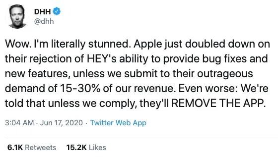 但是今年情况不一样了。6月苹果召开 WWDC 开发者大会前夕,软件公司 Basecamp 因为其新开发的邮件服务应用 HEY 违反了应用商城政策,和苹果彻底撕破脸皮,其首席技术官 David Heinemeier Hansson 在 Twitter 上公开和苹果叫板,并获得了大量支持。