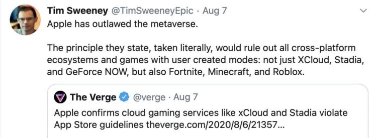 这也让前面提到的 Sweeney 在8月7日那条关于苹果下架微软 xCloud 应用的抨击推文,在今天看起来更像是 Epic Games 这一波操作的预热。