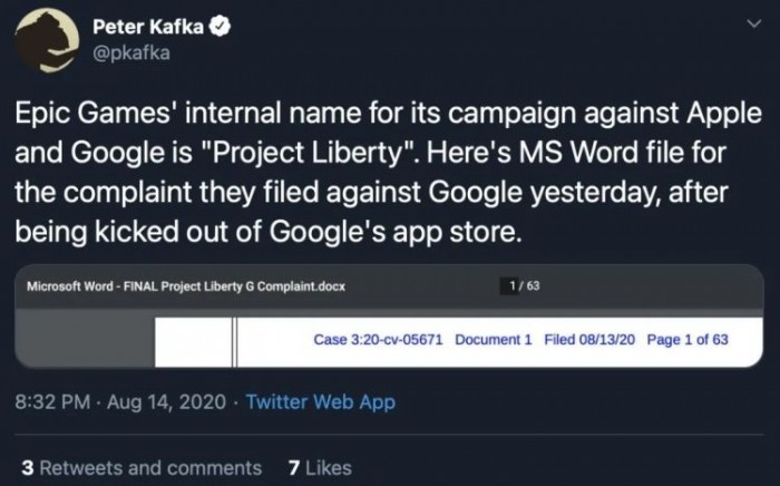 科技媒体 Recode 记者 Peter Kafka 通过起诉书文件名发现,这次同时挑战两大移动应用商城巨头的计划,在 Epic Games 内部叫做"Project Liberty":
