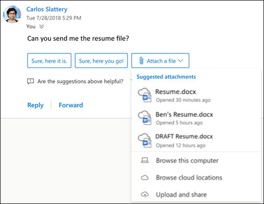 不过,新增的建议回复功能简化了外观设计,允许用户直接从下拉菜单中选择附件。如果你想要选择的附件在这些文件中,那么点击就可以了。新功能还可以让用户直接浏览位置并选择文件。不过必须指出的是,建议文件功能只适用于英文,而且仅限于网页端 Outlook。