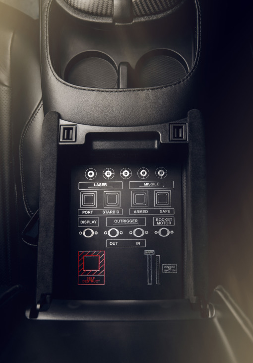 值得一提的,新车还配备了“特工车”专用扶手箱,打开后可以看到各种导弹极光和弹射座椅开关。只不过在可出售的特别版车型中只做成了一个装饰面板,不用担心把自己弹出去。