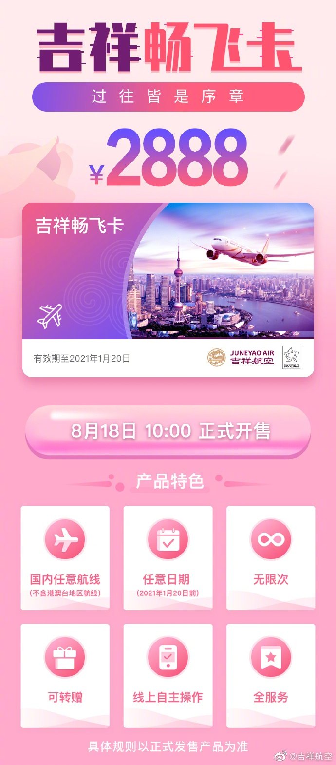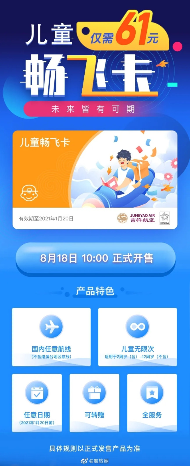 据吉祥航空方面介绍,“吉祥畅飞卡”与“儿童畅飞卡”是基于中国商旅和度假型旅客出行需求而推出,产品将惠及成人旅客与二至十二周岁儿童旅客。