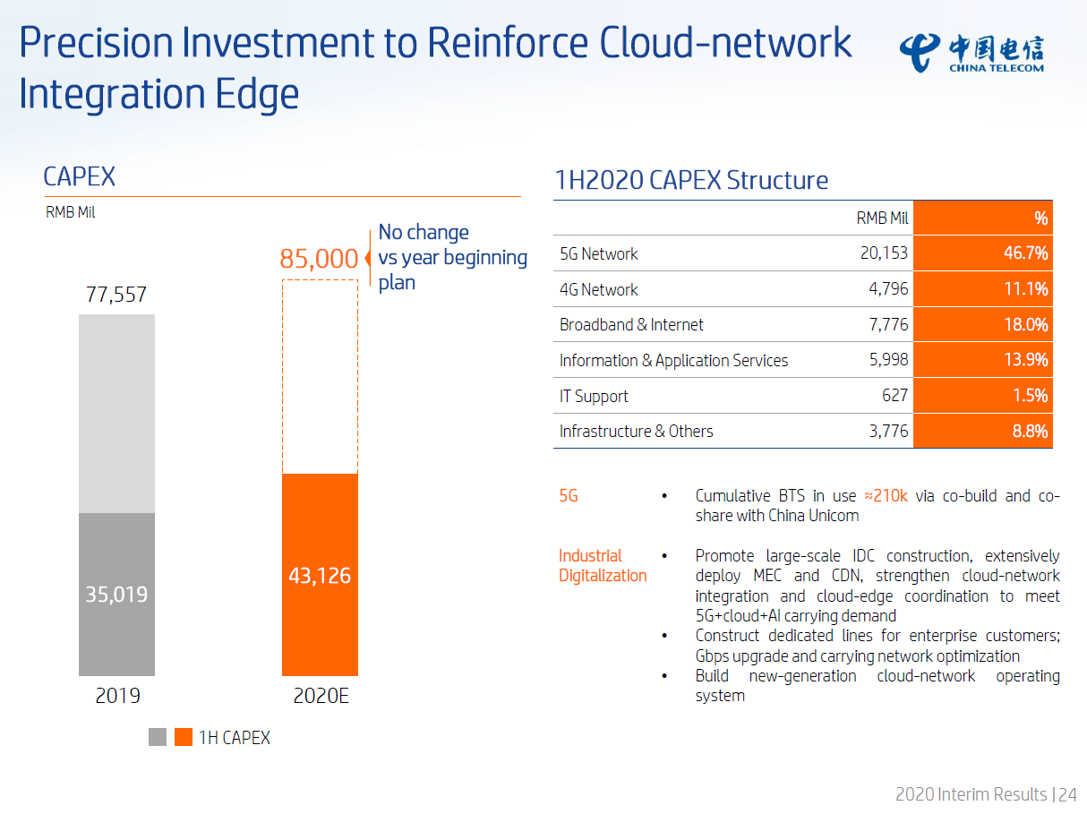 今日,中国电信公布2020年中期业绩。报告期内,中国电信资本开支人民币431.26亿元,其中5G相关资本开支201.53亿元,占比达到46.7%。与此同时,中国电信指出将保持全年850亿元资本开支不变。