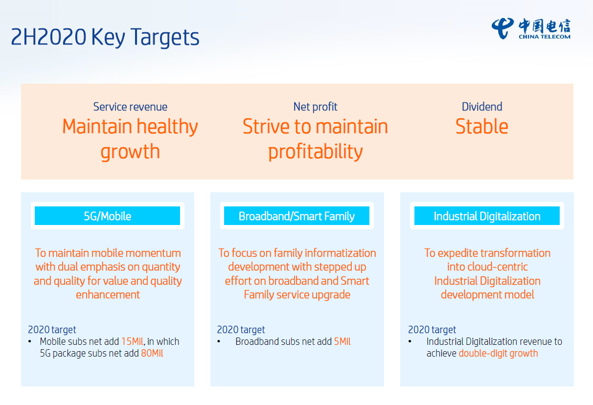 对于下半年的发展目标,中国电信指出,移动业务方面继续保持增长势头,并强调数量和质量并重,实现价值提升。目标2020年实现移动用户数净增1500万户,5G套餐用户数净增8000万户。