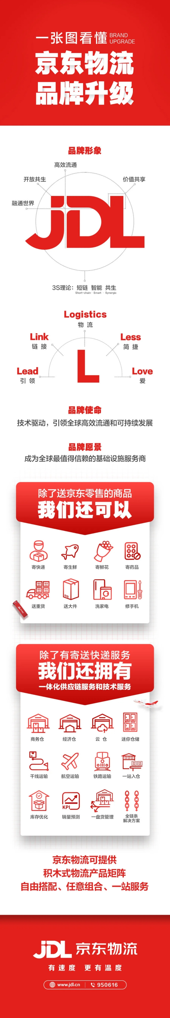 品牌形象升级。京东物流的品牌形象将以更年轻、更科技、更开放的形式与大家见面。JDL中的JD即京东,是京东物流发展的根源和价值观指引,L是Logistics(物流),也是Lead(引领)、Link(链接)、Less(简捷)和Love(爱)。用更简捷的产品、更前沿的技术,实现更广泛的链接、提供更温暖的服务,是我们持续的追求。