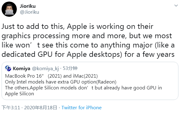 即便如此,@Jioriku 还是对 @Komiya_kj 的预测泼了一盆冷水。至少在接下来的几年里,我们或许无法看到 Apple GPU 在桌面领域掀起大的波澜。