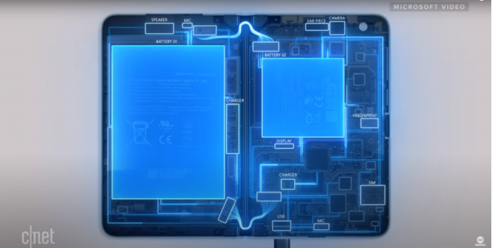 如图所示,在Surface Duo内部有两块电池,分别在两块触摸屏的背部,其中一块电池容量占据了背部大部分面积。