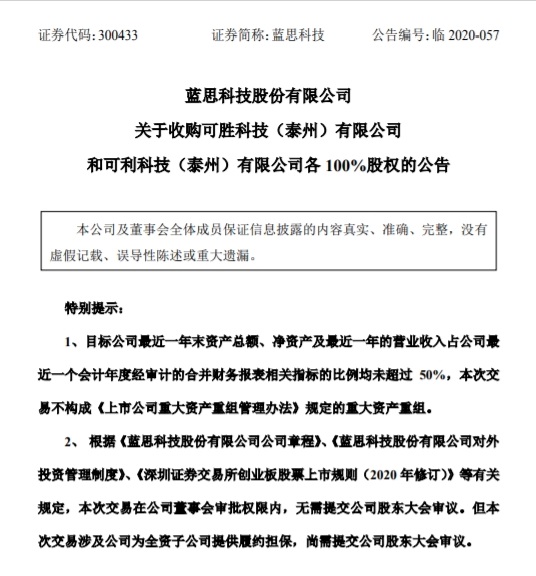 可成科技向蓝思科技集团出售两家在中国大陆间接投资的公司