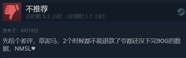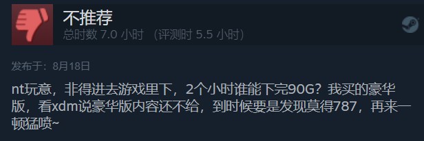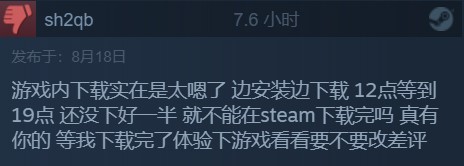 玩家指出该游戏在下载、安装、卡顿等方面存在巨大问题,该游戏不能直接从Steam下载,而后续下载速度相当慢,好多玩家好几个小时下不完,直接错过了退款时间;而且下载过程还容易被打断,还有人遇到黑屏闪退等问题。此外还有不少玩家表示豪华版奖励内容丢失,提示重新购买。