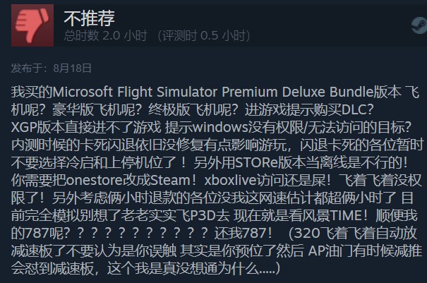 不过游戏本身的质量基本没有受到差评,少数顺利进入游戏的玩家表示这确实是一流的模拟飞行体验,大量真实的飞机和机场令人身临其境。有玩家推荐不要购买Steam版本,不如直接从Windows商城跨区购买。