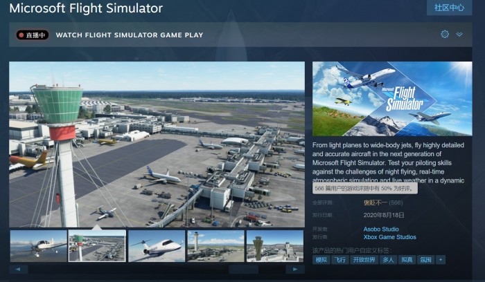 《微软模拟飞行》今日已经正式在PC端发售,此前获得媒体一致好评称赞,IGN也为其打出了10分的满分,但是目前,在Steam上《微软模拟飞行》收获的566篇评测中,只有50%的好评,褒贬不一,目前游戏售价59.99美元(约合人民币415元)。
