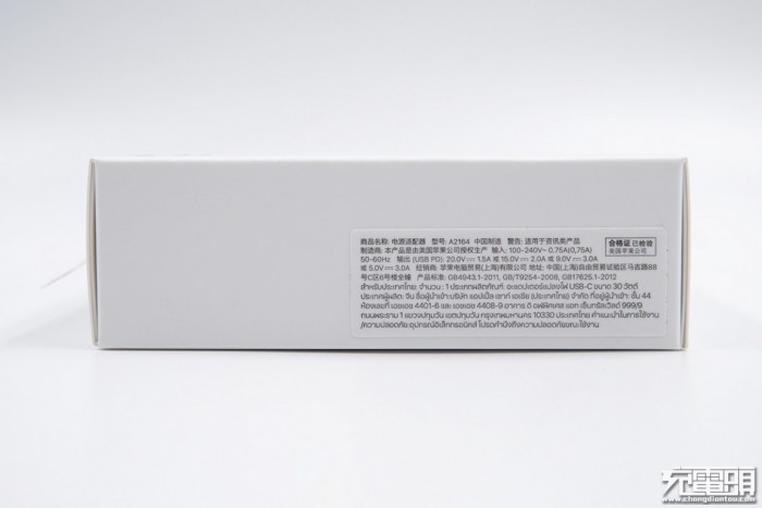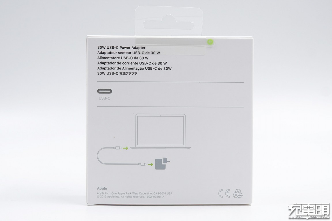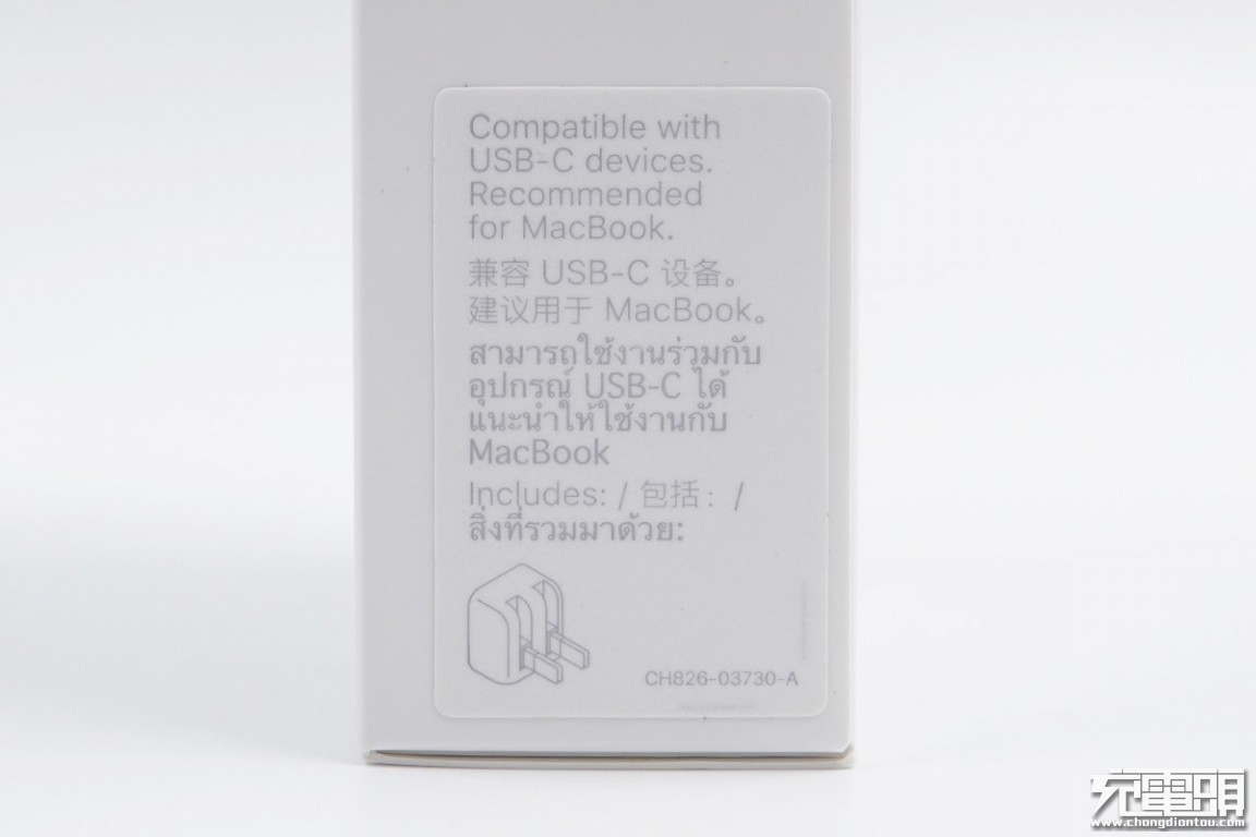 背部上面仍然印有多国语言的产品描述,往下是一个USB-C示意图,再往下是充电器给MacBook充电的示意图。底部贴纸上则印有条形码等产品信息。
