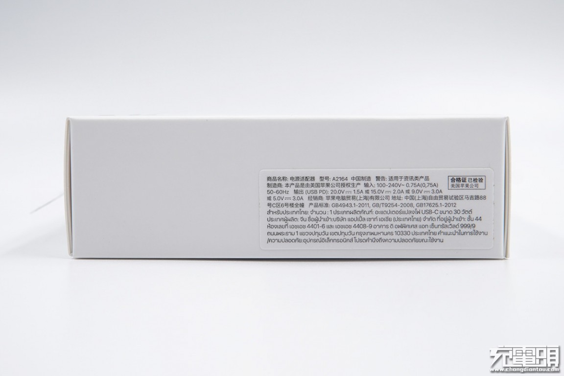 充电器底部使用多国语言印有参数,与包装盒上的信息基本一致。