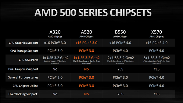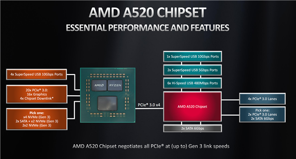 与此同时,A520芯片组的规格参数也终于公开,相比于A320主要是将芯片组的通用输出通道从PCIe 2.0 x4升级为PCIe 3.0 x4,同时完美支持三代锐龙,此时可额外获得四个USB 3.0接口。